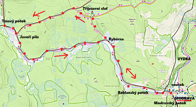 Z Modravy podél Roklanského potoka na Rybárnu, na Tříjezerní slať, k Tmavému potoku, na Javoří pilu a zpět kolem Roklanského potoka až do Modravy.