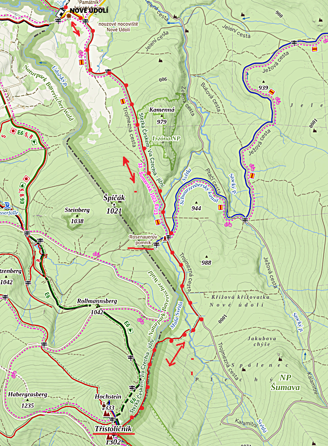 Z Nového Údolí po ČTZ k Rosenauerovu památníku, pak výstup na Třístoličník, zpět po stejné trase, odjezd vlakem z Nového Údolí do Stožce, pak autem Libušky do Borových Lad.