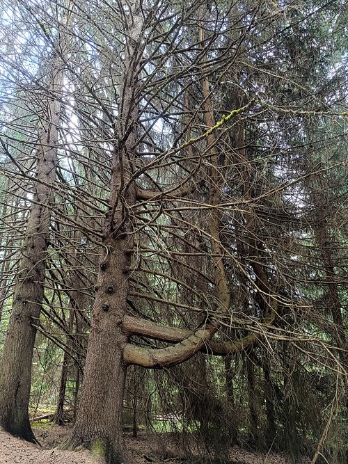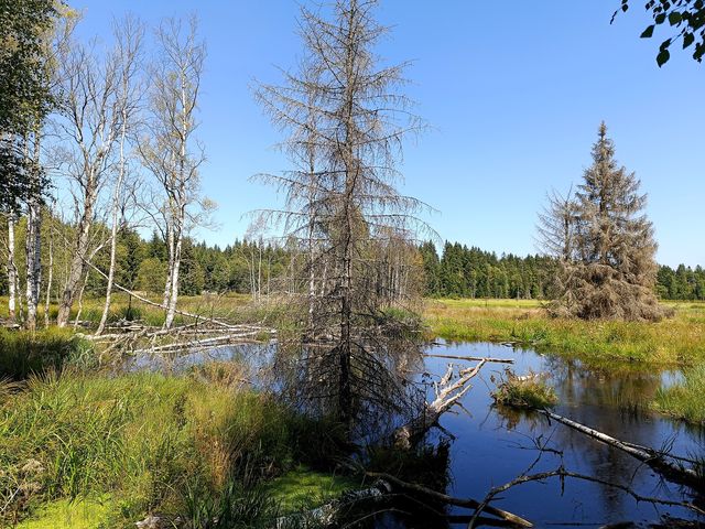 Při minulé návštěvě před několika lety byla nádrž sice už prázdná, ale znatelná, teď jen sítiny a tvrdá zem, kolem vše kvůli kůrovci vykácené.