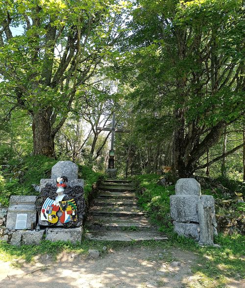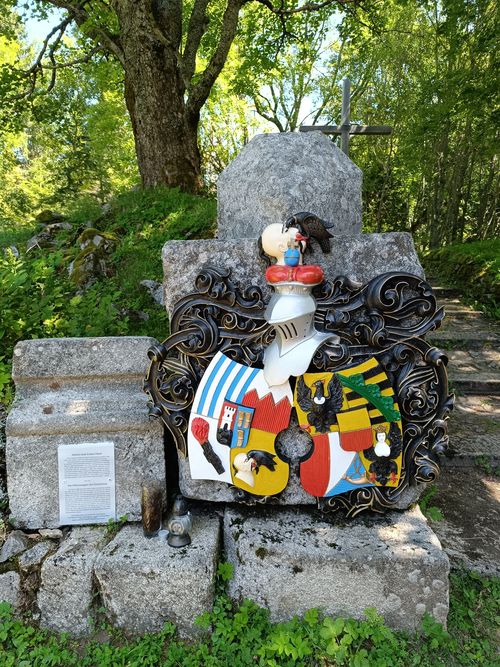 Nemohli jsme nezajít na hřbitov a památníky v okolí. Hřbitov je upravený, původní malovaný alianční erb Josefa ze Schwarzenberku a Idy z Lichtenštejnu, který býval umístěný nad vchodem kostela sv. Jana Křtitele, je opraven sytými barvami – nevím, jak to bývalo dřív, ale uložen na zemi vypadá až pouťově.