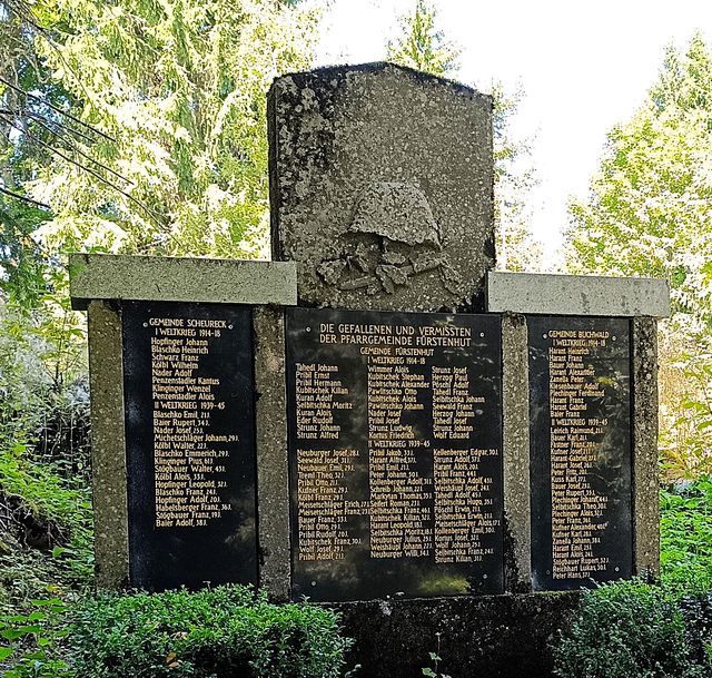 Opravený památník padlým u bývalého kostela. Text: Padlí a zmizelí farnosti Knížecí Pláně v I. a II. světové válce. Zleva muži z obce Scheureck (Žďárek), uprostřed z Knížecích Plání, vpravo padlí z obce Bučina.