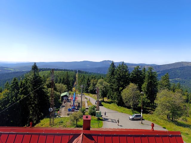 Výhled z rozhledny na trasu lanovky na Pancíř – tou cestou jsme se vydali do Železné Rudy.