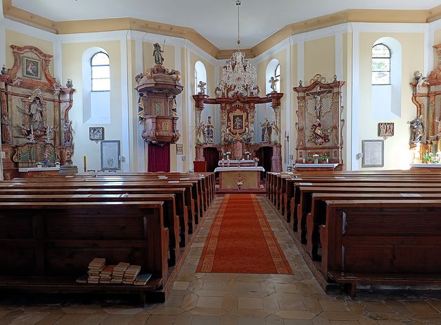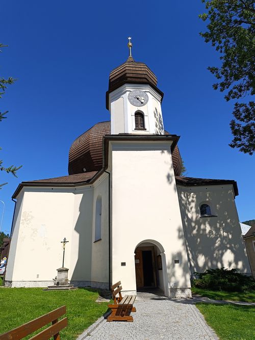 Barokní kostel byl za počátku 18. století vybudován na půdorysu šesticípé hvězdy se dvěma kopulemi s hvězdou. Střecha je krytá šindelem, komplikovaný krov je dílem místního tesaře Matyáše Lehnera. V 90. letech byla provedena nákladná rekonstrukce.