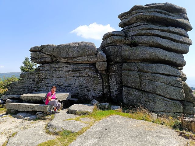 Na kamenné lavici u kamenného stolu pod skalami na Třístoličníku – zcela blažená!