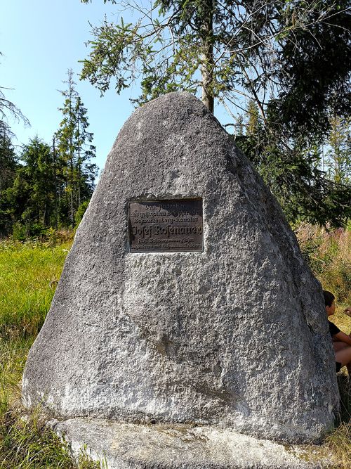 My jsme šli po ČTZ k Rosenauerovu památníku (Inženýr Josef Rosenauer /1735–1804/ byl stavitelem šumavských plavebních kanálů). Cesta dobrá, ale krajina k nepoznání změněná. Původně byl památník v hustém lese, na kopci nad památníkem byl Jelení smyk, tj. nádrž, která se vypouštěla do kanálu při plavení dřeva.