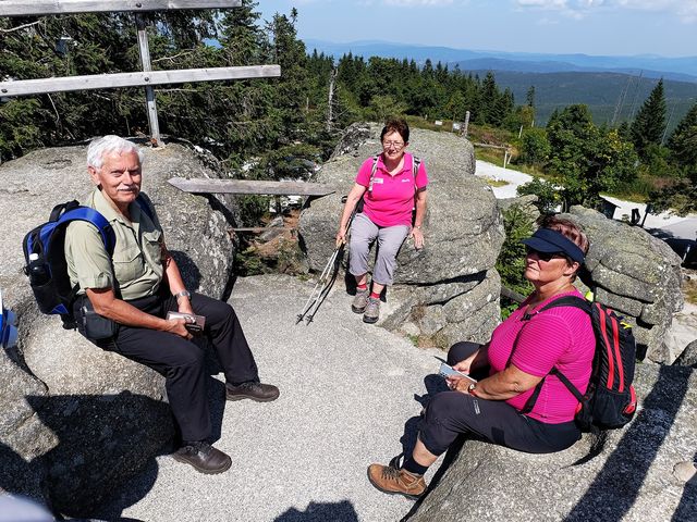 Konečně cíl – výstup na vrcholovou skálu, kde jsou tři sedátka do tří států – Česka, Rakouska a Bavorska, výhledy krásné, vítr mírnil pálící slunce.