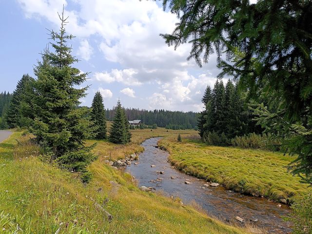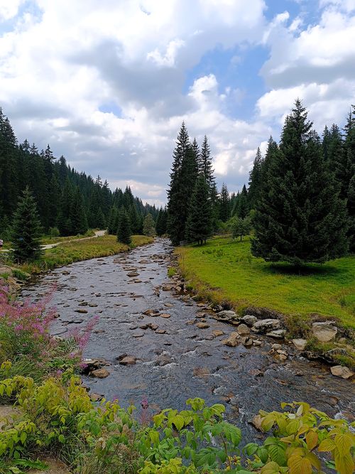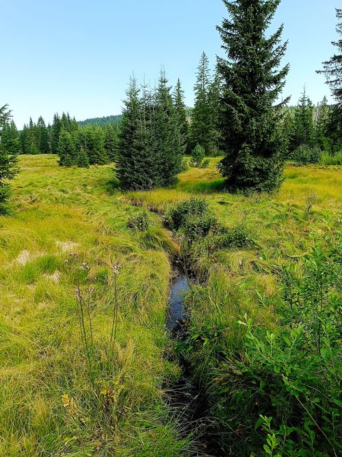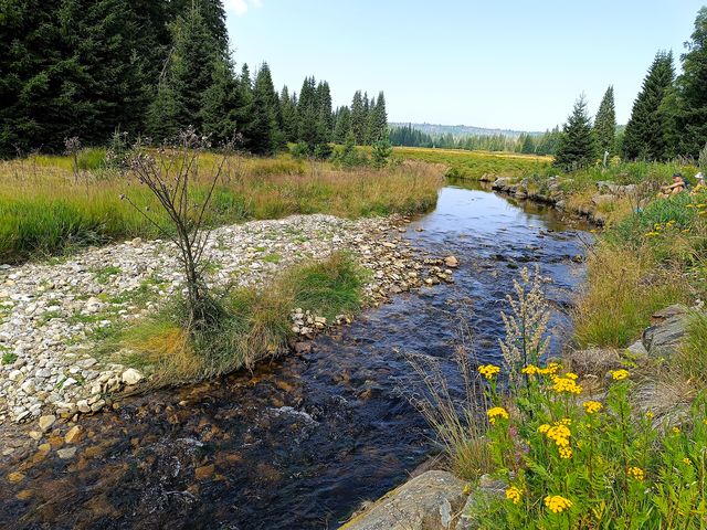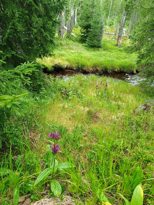 Modravský potok zdobený elegantními hořci a dalšími květinami nabízí okouzlující vycházky.