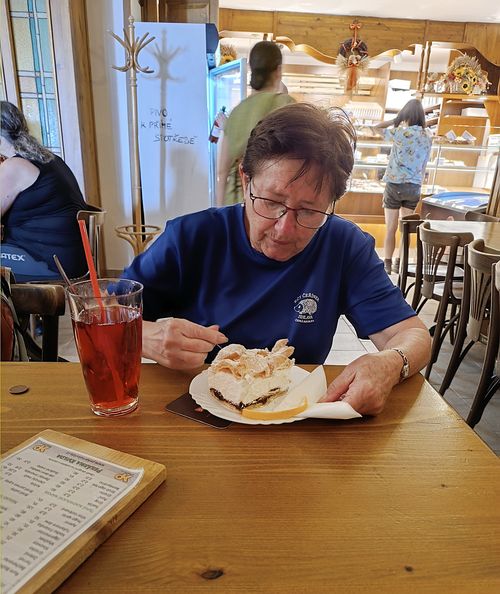 Cesta, většinou lesem, velice hezká, 29 °C, snesitelné. Ušli jsme 9 km. Našli jsme tu lidovou jídelnu, kde nám minulý rok tak chutnalo, bylo nedlouho před třetí hodinou, v 15.00 zavírali, takže výběr nebyl až tak velký, ale všichni jsme byli s nabídkou spokojení.