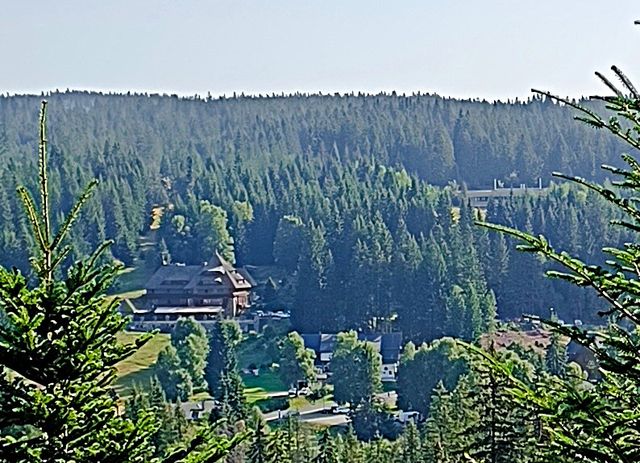 Výhled z trasy ZTZ nad Modravou – vlevo je Klostermannova chata, vpravo nízká luxusní rezidence Zdeňka Bakaly.