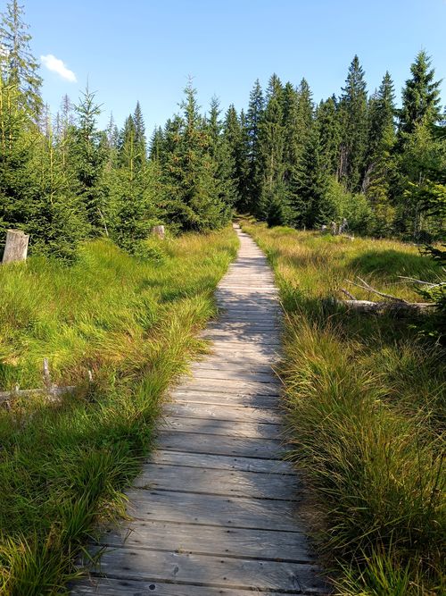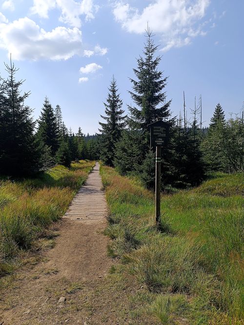 Vyjely jsme s Libuškou autem do Modravy, v 9.15 jsme vyšly z parkoviště a po ZTZ se daly přes Cikánskou slať na můj milovaný Březník. Zpočátku hodně do kopce, nad Modravou jsme viděly Klostermannovu chatu a nejasně Bakalovo sídlo v lesích.