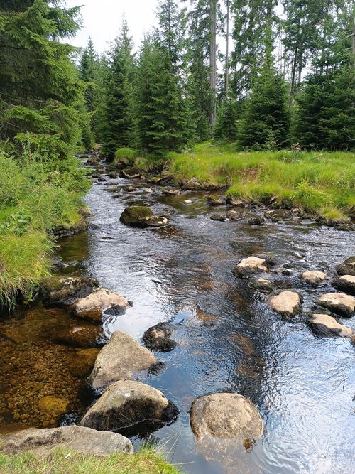 Množství odstínů zelených barev se odráží v bystře tekoucím Modravském potoce.