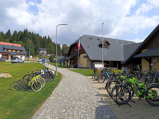 Střed Modravy – půjčovna kol a budova informačního střediska.