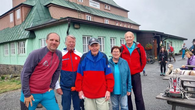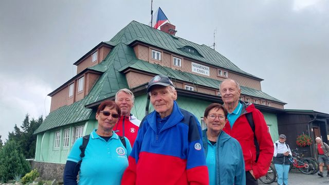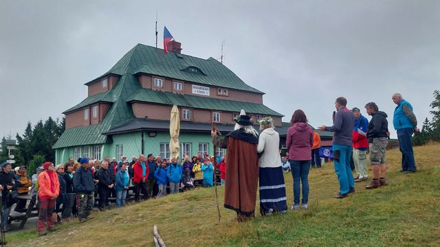 Zašli jsme do chaty, dali si občerstvení a čekali do 11té hodiny, kdy začínala slavnost na plošině před budovou. Naštěstí v té době ustal déšť – vyslechli jsme projevy starostky Deštného, pak předsedy oblasti KČT Hradec Králové, účastníky pozdravil i člen KČT, majitel CK Hoška Tour z Lázní Bělohrad. Závěrečné slovo patřilo emeritnímu předsedovi KČT Ing. Janu Havelkovi – jeho projev měl, jako vždycky, vysokou úroveň!
