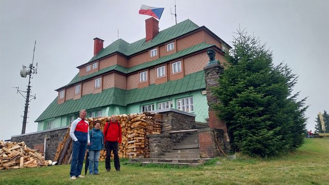 Vyjeli jsme ráno v 7.30 z Jihlavy autem s Pavlem a Mílou Bradovými a Václavem. Počasí zlobilo, chvílemi drobný déšť, po krásných dnech první deštivý. Silně se ochladilo, my jsme jeli do Orlických hor, kde bylo zataženo, mlha a každou chvíli dešťové přeháňky. Auto jsme nechali na parkovišti pod Masarykovou chatou a vystoupali do kopce k ní. Bylo po desáté, když nás organizátoři přivítali a obdarovali pamětním listem s akvarelovým obrázkem Masarykovy chaty a vizitkou s vyobrazením chaty a Masarykovy busty.