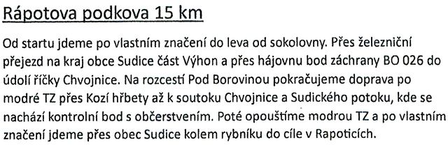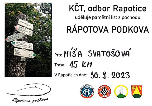 V cíli jsme si dali řízek s chlebem – výborný, čerstvý domácí, a točenou zonku. Naprostá spokojenost!! Pochválili jsme pořadatele, kteří jen zářili, dostali jsme pamětní list a placku Rápotova podkova.