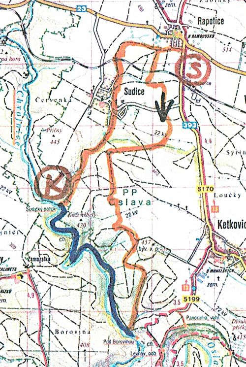 Dál jsme šli už zase po červených fáborkách do Sudic a Rapotic.