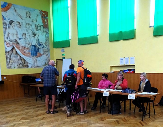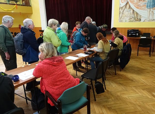 Z nádraží jsme šli asi kilometr do sokolovny, kde byl start i cíl pochodu. Organizátoři nabízeli trasy 15, 25, 33 a 50 km, vybrali jsme si 15 km kvůli odjezdu vlaku v 15.25. Při platbě startovného jsme dostali popis trasy, tatranku a vyrazili po jejich vlastním značení. Pro nás platily červené fáborky, které byly pečlivě umístěné všude, kde bylo potřeba, cesta vedla většinou listnatým lesem, byla dobrá a na každém rozcestí, kterých bylo hodně, nás spolehlivě vedly třepotalky