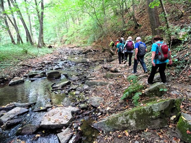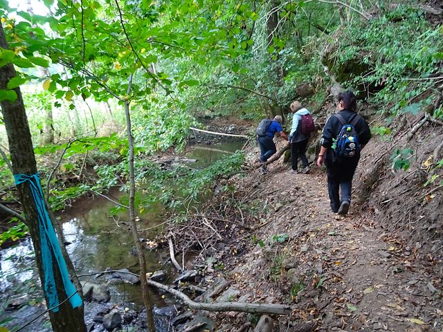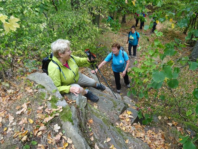 Ve vlaku a pak na startu, a též na trase jsme potkali třebíčské turisty. Cesta byla hodně členitá, zvláště nad Chvojnicí v místech, kterým se říká Kozí hřbety, byly cesty ve svahu nad řekou docela úzké, někdy bylo třeba překračovat padlé stromy a kořeny. Je hodně sucho, proto cesta nebyla nebezpečná.