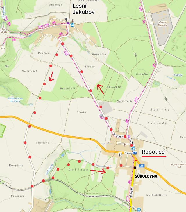 Po příjezdu do Rapotic jsme se v tělocvičně sokolovny, kde byl štáb turistického pochodu, přihlásili na nejkratší trasu s délkou 5 km. Výhledy z návrší nad řekou Chvojnicí byly utěšené, počasí nám přálo. Před obcí Lesní Jakubov jsme přešli na cestu, která nás vedla zpět do Rapotic.