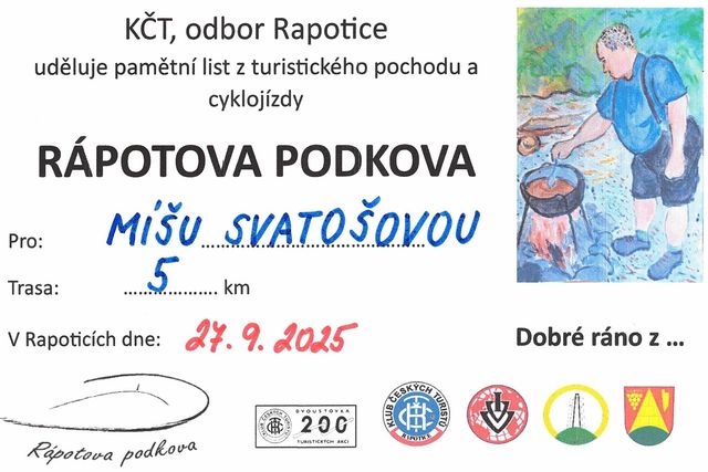 Vyřídili jsme ukončení pochodu, dostali pamětní list a text, který vysvětluje „proč Rápotova podkova“ : Vznik Rapotic je spojován s rodem Přemyslovců – podle pověsti markrabě Konrád, moravský kníže, projížděl tudy se svou družinou a jednomu ze svých nejvěrnějších, Rápotovi, věnoval pozemek, který objel za hodinu na bílém koni. 🙂