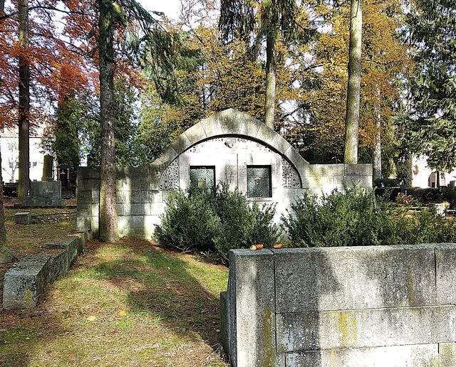 Cestou k východu ze hřbitova jsme se zastavili u velmi zajímavého objektu hřbitovní architektury, u hrobky průmyslníka Karla Löwa (1849–1930), podnikatele z jihlavské čtvrti Helenín.