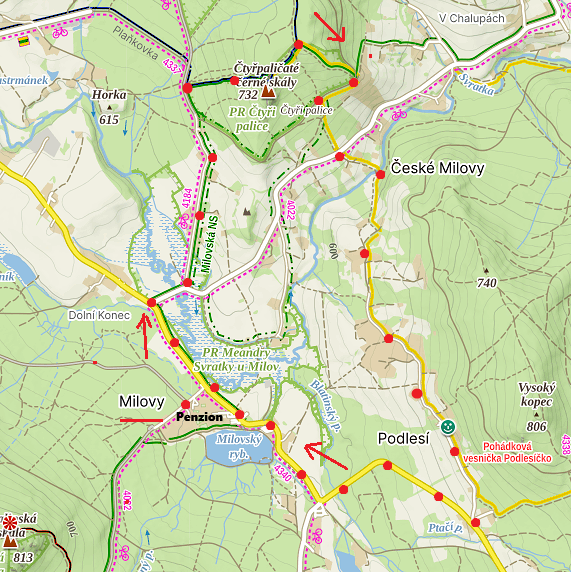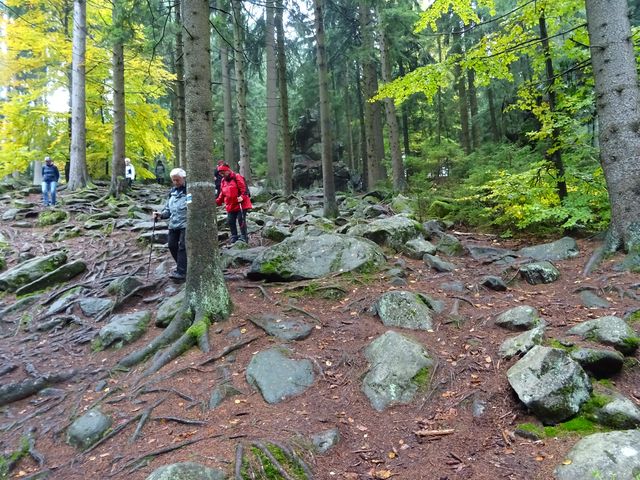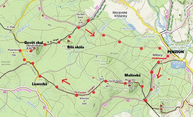 Trasa: Malinská skála, Lisovská skála, Devět skal, Bílá skála – šlo se převážně po značených trasách, jen od Bílé skály neznačenými lesními cestami.