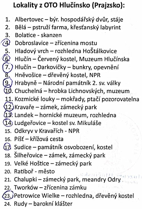 Uvádím také přehled navštívených lokalit, na jejichž základě jsme získali odznak OTO (Oblastní Turistický Odznak) Hlučínsko: