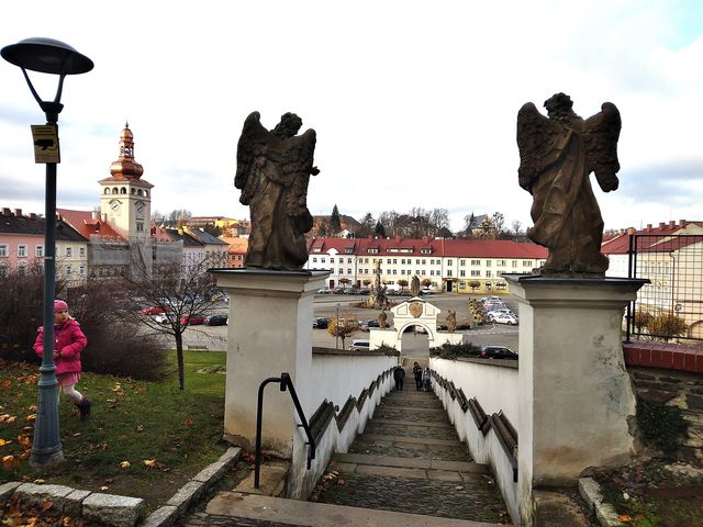 Vydali jsme se na prohlídku města – hezké náměstí olemované ze dvou třetin přírodní hradbou – táhlým, zalesněným kopcem (teď s opadaným listím), na němž stál zámek, pod ním v rohu náměstí bratrský sbor, kde je vybudovaný vzpomínaný památník, a kousek dál na úpatí kopce obrovský kostel.