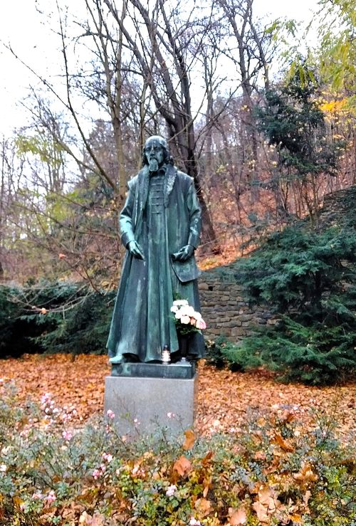 Jenom krátce jsme zašli do parku před budovou Památníku, kde je umístěna bronzová plastika Komenského od Jana Štursy z roku 1924.