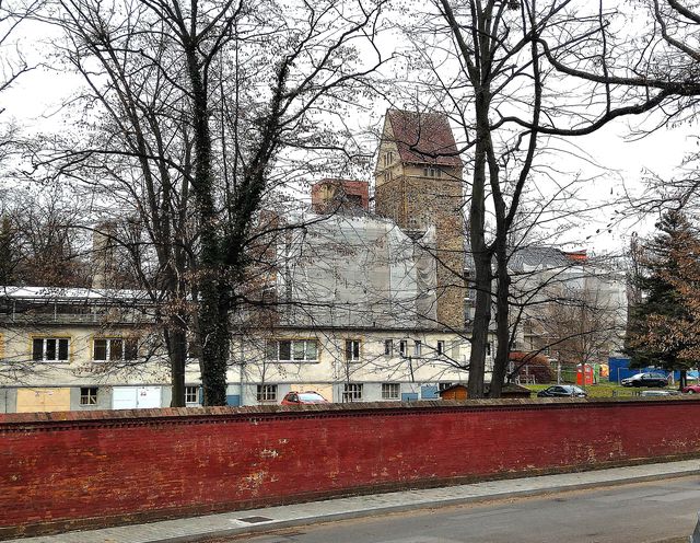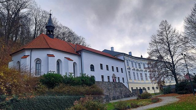 Od kostela jsme vystoupali nejdříve po schodech, pak cestičkami na vrchol svahu k zámku – opravuje se tzv. Dolní zámek, v jehož prostorách město chystá domov důchodců, Horní budova zámku je už opravena a vypadá nádherně.