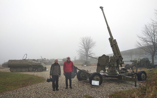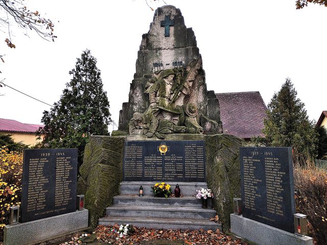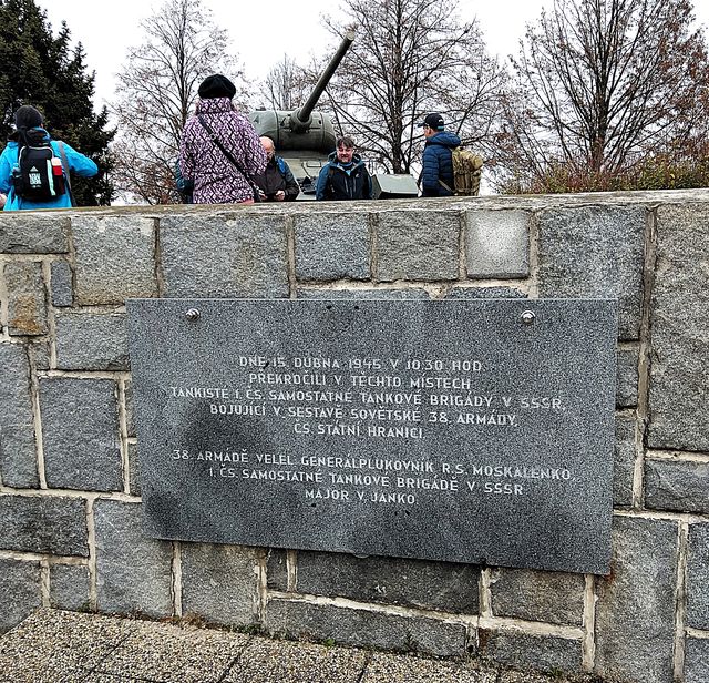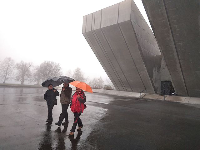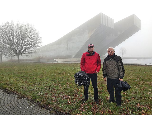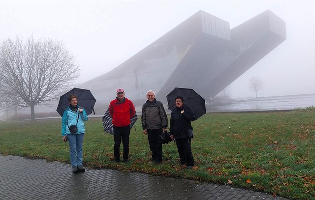 Počasí nebylo v Hlučíně tak zlé, jak předpověď uváděla, takže jsme si užili prohlídky a srdečně se rozloučili s úžasným průvodcem – odjížděli jsme do Hrabyně k památníku II. světové války – dnešní památný den jsme chtěli strávit stylově. Po příjezdu k budově zdejšího infocentra jsme ten obrovský betonový památník na pár desítek metrů pro mlhu, déšť a vítr neviděli.