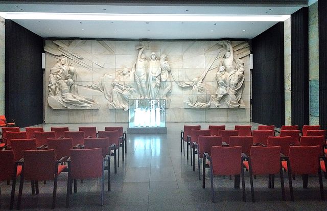 Po vstupu nás však ohromila bezvadná expozice – je tu obrovské přízemí se společenským sálem, kde je v jednotlivých prosklených a nasvícených nádobách prsť z různých nechvalně proslulých míst, kde trpěli a umírali za války lidé.