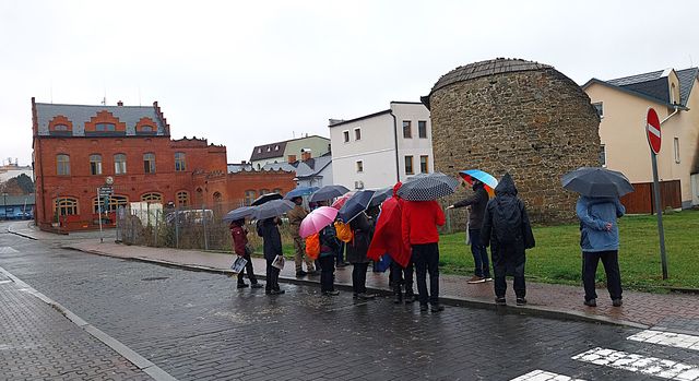Bylo hlášeno velmi nepříjemné, místy až život ohrožující počasí se sněhem, vichřicí a bůhvíčímještě. Měli přijet Věra s Pavlem, ale kvůli té slotě se omluvili. Naše pětice se rozloučila v penzionu a o deváté odjela vstříc nepohodě. Nejdříve jsme absolvovali plánovanou komentovanou vycházku městem – během ní pršelo a byl vítr, přesto nám připadala hodně zajímavá.