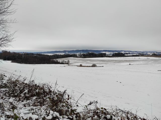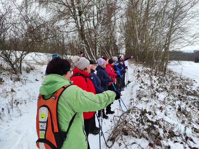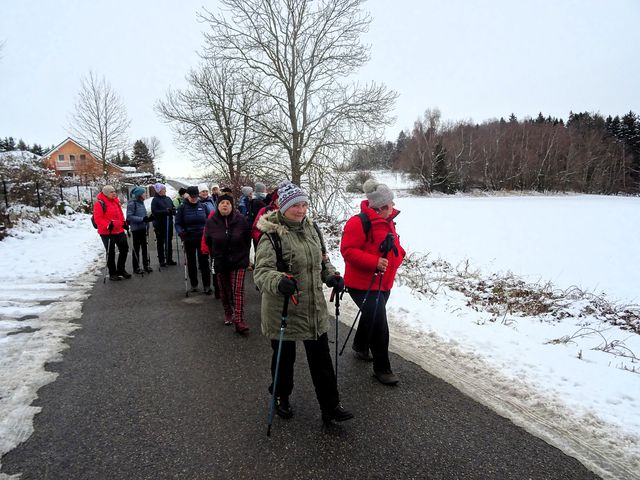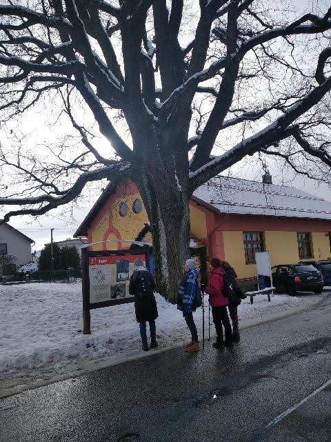 Šli jsme neznačenými, lehce zasněženými cestami skoro pořád lesem do obce Vysoká, což bylo pohodových asi 5 km. Do Vysoké jsme stoupali mírně do kopce, na okolních loukách se vyskytlo i několik nedočkavých lyžařů.