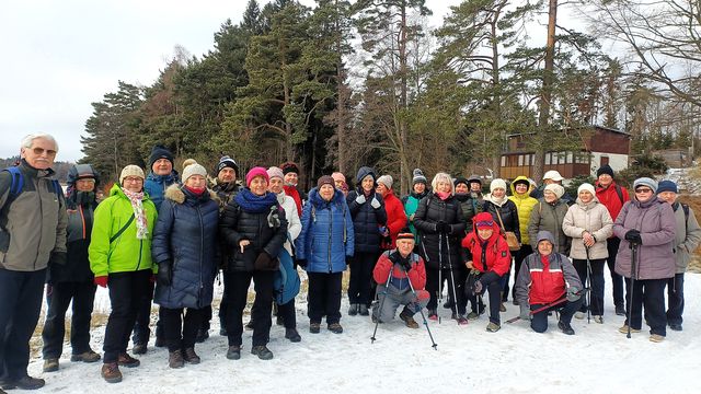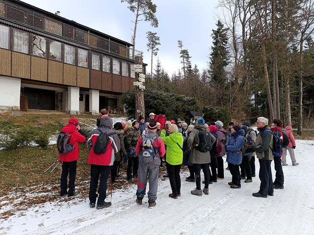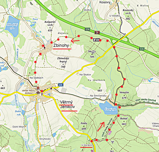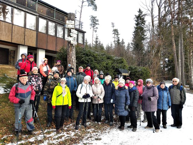 Vycházku připravila, a jako vždycky vedla, Iva Svobodová z KČT Tesla Jihlava. Sešli jsme se na autobusovém nádraží a dojeli do místa zvaného „hájenka V Horách“ u Větrného Jeníkova. Po včelí naučné stezce, která tudy vede ze Smrčné k Trojanskému rybníku, jsme se vydali k Černému rybníku a odtud do obce Zbinohy, poté historickou alejí do Větrného Jeníkova.