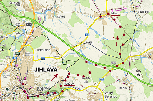 Po modře značené pěší turistické trase z Jihlavy do Polné a Helenín.