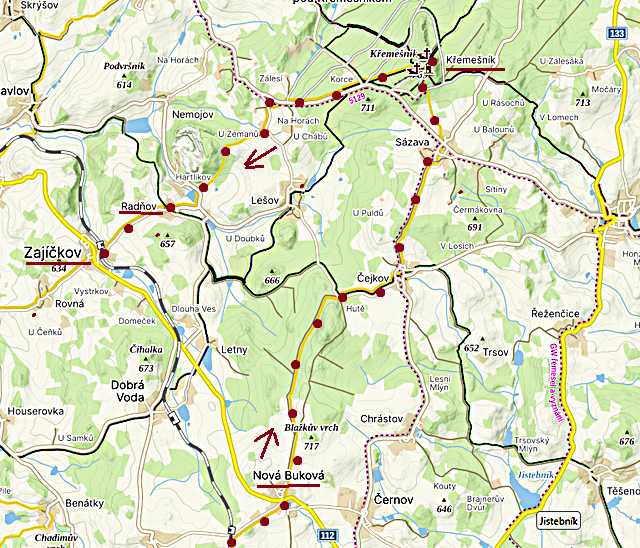 Celý turistický pochod se konal po žluté turistické značce – tedy z Nové Bukové na Křemešník, pak dál kolem Radňova až k vlaku do Zajíčkova – celkem jsme s odbočkami na cestě ušlapali 16 km, k nimž přičítám ještě 2 km cesty k vlaku v Jihlavě, což myslím za té neústupné ledovky docela stačilo.