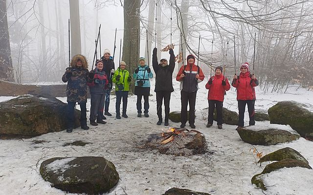 Předtím jsme ale zašli k rozhledně, kterou nebylo v husté mlze na několik kroků skoro vidět a udělali hezkou fotku u dohořívajícího ohně, který tradičně v tomto termínu rozdělávají při svém pochodu Memoriál Ludvíka Kosa (letos 40. ročník) turisté z Pelhřimova, s nimiž jsme se setkali a pohovořili v restauraci.