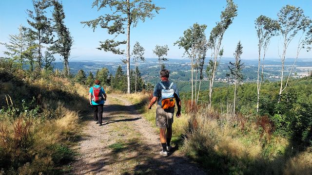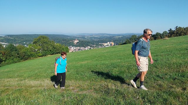 Ráda jsem přijala, vyjeli jsme v 6.15 autem, za téměř 3 hodiny jsme byli v Náchodě, na parkovišti u nádraží jsme nechali auto. Vydali jsme se po ZTZ směrem k nemocnici, pak na Vyhlídku, která má opravdu přiléhavé jméno. Stále jsme stoupali, 3,5 km s výhledy na protější hřebeny a zástavbu v údolí pod nimi. Náchodský zámek postupně začal zapadat do údolí, byli jsme výše, kopec Rozkoš (587 m n.m) – též příhodné jméno kvůli vyhlídce.
