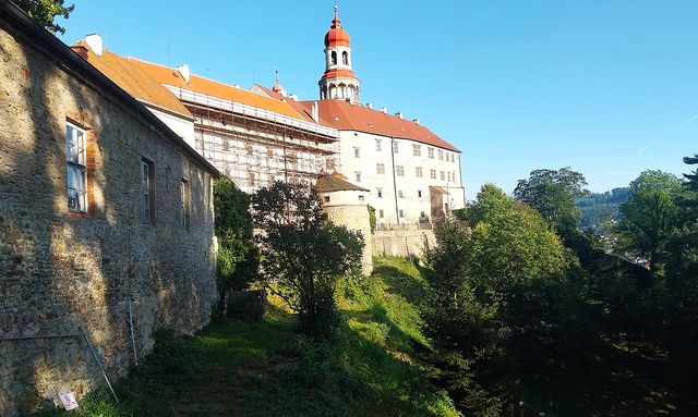 Značená cesta nás dovedla zase do blízkosti náchodského nádraží, kde bylo auto, ale pokračovali jsme pěšky na zámecký kopec. Lokalita je po rekonstrukci, všude úpravné cestičky, lavičky a množství schodů, které vedou na zámecká nádvoří.