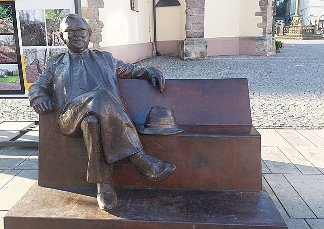 Největší atrakcí na náměstí, poblíž kostela sv. Vavřince, je bronzová lavička, na níž sedí v nadživotní velikosti zdejší slavný rodák, spisovatel Josef Škvorecký. Sedí a usmívá se, vedle něj klobouk, nohu přes nohu, ruku na opěradle lavičky. Jedno místo pro vyfocení zájemců je skoro pořád obsazené fotkychtivými turisty.